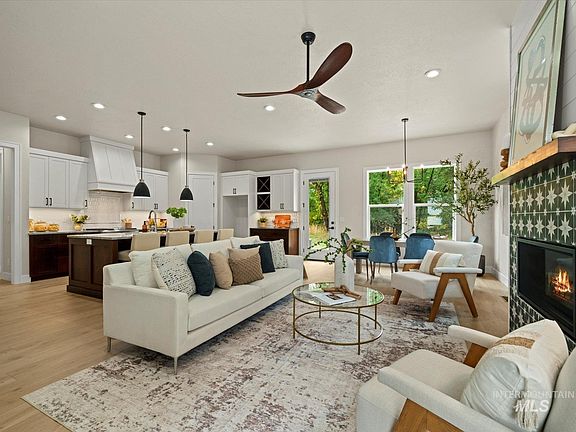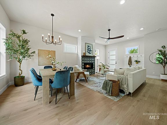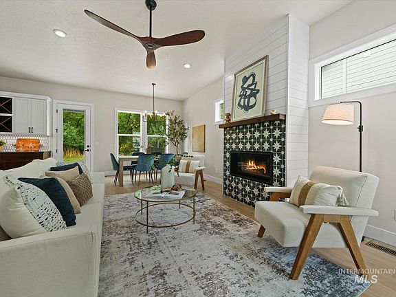 Nestled at the end of a private road, this stunning, new construction home incorporates custom designer finishes and thoughtful upgrades throughout including 10' ceilings on the main level and 9' ceilings upstairs, abundant storage, ceiling fans in every room and USB/USBC charging outlets. A charming front porch with a swing welcomes you inside to an open-concept layout centered around a sun-drenched living area, anchored by a tile/shiplap surround gas fireplace with a warm cedar wood mantle. Durable, water-resistant plank flooring flows seamlessly into the entertainer’s kitchen, featuring soft-close cabinetry with cookware pullouts, a 36-inch natural gas range, and an expansive granite island with breakfast bar seating. The desirable main-level master suite offers a serene retreat complete with dual sinks, a glass-enclosed shower, and a spacious walk-in closet. Upstairs, two additional bedrooms and a full bath complete the versatile layout. Enjoy outdoor living in the private backyard with no rear neighbors from the patio plumbed for natural gas and wired for a hot tub. Drip and sprinkler lines are in place—ready for your plants and grass—or enjoy the low-maintenance xeriscaping. Insulated three-car garage is conveniently equipped with an EV charger and pre-plumbed for a water softener. Quick access to the Boise River and Greenbelt just steps away!