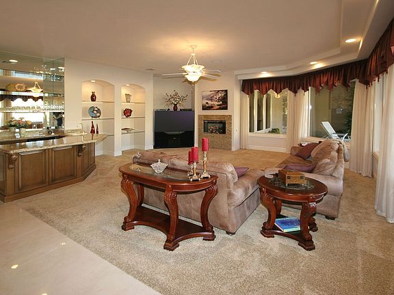 Very impressive Leaded double entry doors open to a spectacular dramatic foyer with 22 foot ceilings. Dramatic open floor plan with vaulted ceilings. Large living room boasts entertainment center and fireplace. Den has a bar and gas fireplace. Huge master suite. Master bath has dual walk-in closet, double sinks with vanity. Kitchen is a Chef's dream! Pool and spa with water feature.
