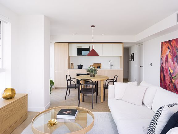 Dynamic vertical formWelcoming public plazaFully equipped fitness studioLight-filled layoutsLarge covered balconiesMatte white cabinetryNatural oak tones