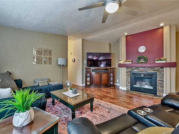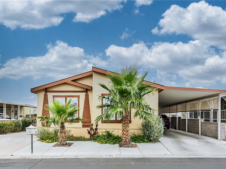 Not just a home, but a lifestyle! This 3 bed, 2 bath home is nestled in Royal Ridge Estates, a gated 55+ community designed for comfort and connection. Upgrades include granite countertops, skylights that fill the home with natural light, newer stainless LG appliances, a cozy gas fireplace, fresh carpet, and a blend of hardwood and laminate flooring. Major upgrades bring peace of mind, including a new HVAC system with a 10-year warranty, a spacious two-car covered carport, an expansive awning with a sunscreen system, and three storage sheds. The primary ensuite offers a step-in shower and a HUGE walk-in closet, while custom shutters and blinds add a refined touch. Community amenities feel like a retreat, featuring a clubhouse, pool, sauna, gym, library, putting green, dog run, available RV parking, and a full calendar of activities. All just minutes from Allegiant Stadium, shopping, dining, medical, and the future ballpark. Low HOA includes water and sewer!