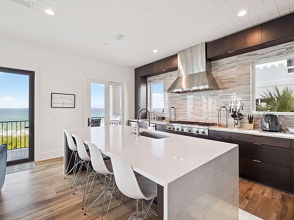 Welcome to your Gulf-Front Oasis! This stunning five-bedroom, five-bathroom home is located in an exclusive gated community along Scenic 30A. A true Gulf-front masterpiece, it blends contemporary design with refined coastal elegance to create a one-of-a-kind retreat.Designed for entertaining, the open-concept kitchen and living area flow seamlessly onto expansive decks overlooking the Gulf. The gourmet kitchen is a chef's dream, featuring Thermador and KitchenAid appliances, bespoke cabinetry, and a dramatic nano glass wall that opens to breathtaking views of the Gulf of Mexico. Six private balconies provide multiple vantage points for enjoying the shoreline, while a spacious media room with Gulf-front balcony access offers the perfect setting for movie nights or casual gatherings.