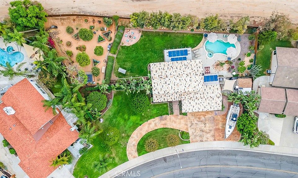 Step outside to your private backyard retreat featuring a sparkling pool and spa, a built in BBQ island, two covered patios ideal for outdoor dining, a newly built outdoor firepit with colored and stamped concrete, and decorative rocks and natural stone accents throughout the backyard landscape. The yard also includes a gated citrus grove and orchard with raised garden beds and table grapes on a trellis. Two storage sheds provide ample additional storage space. The home further features automated smart irrigation and landscape lighting, and the exterior has been freshly painted for a clean, move in ready appearance.