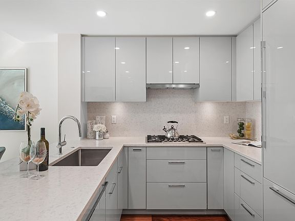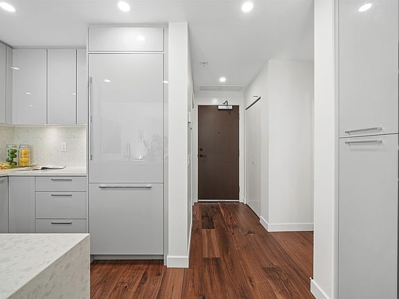 Private direct accessLarge west-facing patioSleek kitchenFull-size integrated bosch appliancesAmple cabinet counter spacePremium walnut hw flooringNuheat in-floor heating