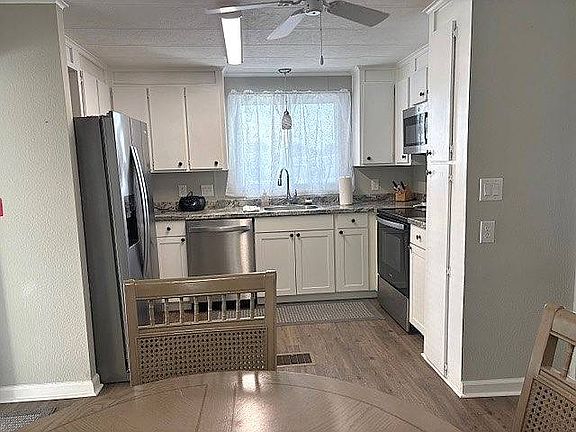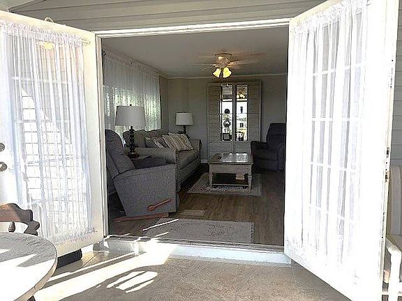 This beautifully furnished, remodeled 2/2 is a must see! There is an enclosed screen room under the carport and a screened in front porch out front. Open concept living with a spacious kitchen, dining & living room area, Matching laminate floors throughout. with updated bathrooms, This beauty is Move in ready. A/c 2022, New Alum. roof over & carport in 2025. Laundry area in shed under carport. 9 windows were replaced in 2012. Call for your tour today!