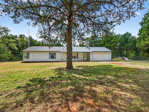 Outside, you'll find a small shop, multiple outbuildings, a covered front porch perfect for relaxing, and a large tower antenna. The metal siding and metal roof offer durability and longevity, while the property itself is ready for your personal touch and updates.