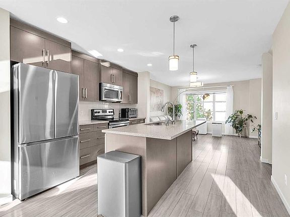 Welcome to this stunning townhouse with a double attached garage, ideally located in the desirable community of Evanston. Surrounded by greenery, scenic views, and beautiful walking and biking trails, this home offers both tranquility and convenience. Families will love the easy access to schools, shopping, dining, and everyday amenities in this vibrant neighbourhood. The entry level features a bright and spacious home office, perfect for working from home or studying, as well as additional storage space and direct access to the double attached garage. Upstairs, the open-concept living area is filled with natural light from large windows, creating a bright and airy atmosphere. The Chef’s kitchen is a true highlight, complete with stainless steel appliances, abundant cabinetry, upgraded quartz countertops, a large centre island with breakfast bar seating, and a pantry. The adjacent dining area opens onto a private west-facing balcony, ideal for relaxing or entertaining. The upper level offers two generous master bedrooms, each featuring a full ensuite bathroom and a bright walk-in closet with windows. A convenient laundry area completes this floor. This home blends modern finishes, functionality, and an unbeatable location. Fridge (2025), Dishwasher (2025), Washer (2025), Dryer (2025), Hot Water Tank (2025), Humidifier (2025).