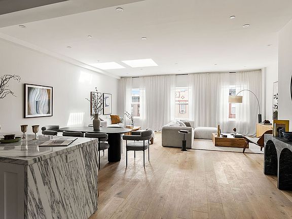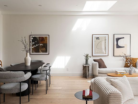 An graceful entry leads to the massive, 25-foot wide, loft-like living and dining area - where soaring ceilings, oversized windows, dual-skylights, and 6-inch white oak floors create a luminous and welcoming atmosphere awash with natural light.