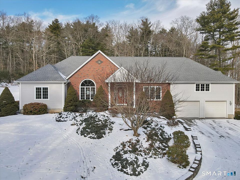 Custom built split style contemporary ranch, privately nestled on over 5 acres and set well back from the road, offering exceptional privacy and a true sense of retreat. This move-in-ready home features an open, thoughtfully designed floor plan anchored by a dramatic great room with hardwood floors and a gas fireplace. The eat-in kitchen is beautifully appointed with granite countertops and flows effortlessly into the cathedral ceiling dining room, ideal for both elegant entertaining and everyday living. The primary bedroom suite is privately located on its own wing, offering a full bath and walk-in closet, while two additional bedrooms and a full bath are situated on the opposite side of the home, providing an ideal layout for privacy and separation of space. A spacious home office with rich cherry inlay flooring adds warmth and versatility. Lovingly maintained by the original owner, the home reflects pride in ownership throughout. Recent improvements include a new roof (2024) and a new oversized deck (2024) overlooking tranquil wooded views, abundant wildlife, and peaceful natural surroundings. A rare blend of craftsmanship, privacy, and refined comfort! This home delivers luxury living with a relaxed countryside feel. Broker/Owner Related Offer Deadline Monday 9am 1/12. Final and Best!
