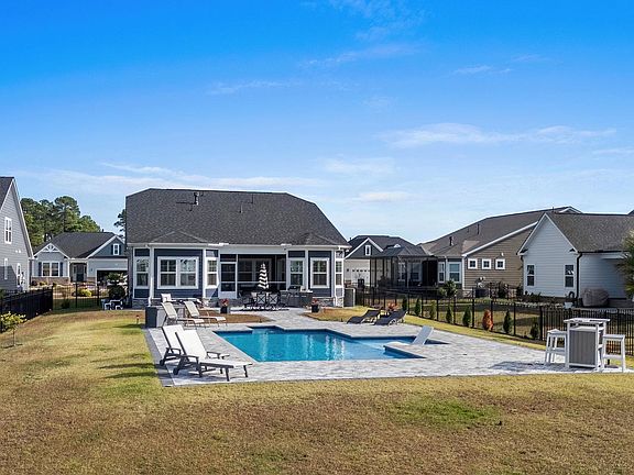 Embrace the ultimate relaxed coastal lifestyle in this stunning lakefront property, where high-end upgrades meet breathtaking natural beauty. This home is an entertainer's dream, offering an unparalleled outdoor oasis and an elegant, move-in-ready interior. From the moment you step inside the wainscoting-accented entry, you are greeted by an expansive, open-concept floor plan flowing with durable, solid surface flooring, ensuring comfort and style without the maintenance. The home is thoughtfully designed to maximize the incredible views of the 56-acre lake and custom saltwater pool, blending everyday living with a permanent vacation feel. The heart of the home is the gourmet kitchen equipped with upgraded countertops, a farmhouse-style sink, large pantry, and is complemented by a natural gas fireplace in the living area. The primary suite is a true retreat, offering abundant light, direct views of the lake and the custom saltwater pool, a large walk-in closet, double sinks, and a luxurious tiled master shower. Designed for flexible living, the home includes a large office accessed via French doors, perfect for remote work, while a private, spacious upstairs bedroom and bath suite is ideal for multigenerational living or guest privacy. The outdoor living space is an entertainer's dream, featuring a screened patio, a custom saltwater pool, and a fully fenced, oversized backyard designed to feel like a private resort, perfect for families and pets. Both the front and back patios feature durable, upscale epoxy finishes. Enjoy breathtaking sunsets from nearly every vantage point. Located in the popular Carolina Forest area of Myrtle Beach, Indigo Bay is a natural gas community with excellent amenities coupled with an affordable HOA fee. Enjoy resort-style living with access to a community clubhouse, saltwater pool, fitness center, pickleball courts, a kayak/paddleboard launch, and a dog park just steps from your door. This home delivers exceptional value with every imaginable amenity. Don't miss this opportunity! Call today to schedule your private tour.