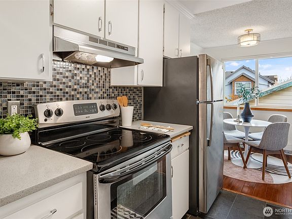 Sunny and quiet top-floor corner unit in sought-after Upper Fremont! Step into your updated and brightly lit home, featuring hardwood flooring and a smart, functional layout. The modern kitchen boasts quartz countertops and a stylish tile backsplash, while the bathroom has been refreshed with a subway tile surround and updated fixtures. You’ll love the large living space along with a true dining room. Relax and enjoy peek-a-boo views of the city and Mt. Rainier from your spacious private balcony. With dedicated off-street parking, in-unit laundry hookups, and bonus on-site storage, this home has all the essentials. Located just blocks from Marketime Foods, Lighthouse Roasters, Woodland Park, trails, and the best of both Fremont and Phinney.