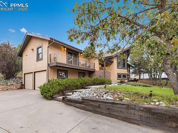 Situated on a quiet cul-de-sac in Upper Skyway, this one-of-a-kind custom home offers timeless character, great privacy & a desirable location within the award winning School District 12. Step inside a spacious open-concept layout with vaulted, beamed ceilings, elegant wrought iron railings, sophisticated light fixtures, & abundant natural light throughout. Designed for both everyday comfort & unforgettable entertaining, this residence features multiple indoor & outdoor gathering spaces. The gourmet kitchen is a true centerpiece- combining warm rustic charm with timeless Italian design elements & featuring rich, hardwood floors, granite countertops, a large custom island, built-in shelves, & a beautiful stained glass window. Enjoy sunrises & city views from the East balcony off the kitchen. Walk out from the kitchen, formal dining room or luxurious primary suite to the expansive 900 sqft. patio. This breathtaking outdoor space is complete with a covered living area, built-in gas fireplace, lush yard & natural Colorado landscaping all around. There is plenty of room for everyone with 6 bedrooms (3 on the upper level & 3 on the lower level), which would also make great office, hobby or workout spaces. The primary suite offers private patio access, an attached spa bathroom with Italian marble floors, vanity with granite countertops, a soaking tub, walk-in shower & walk-in closet. You’ll find a cozy family room in the lower level with a wood burning fireplace, built-in wet bar including a wine cooler, mini fridge, + built-in spirits dispenser, as well as, a large laundry room, huge storage space with an extra refrigerator & plenty of storage cabinets. Additional highlights include; brand new carpet throughout, new roof & new gutters, new laundry room tile, & Anderson windows + doors. Just steps from Bear Creek hiking & biking trails & a short drive to Downtown, OCC & Manitou. This home provides a wonderful Colorado lifestyle- don’t miss the opportunity to make it yours!