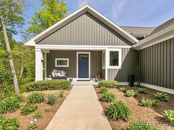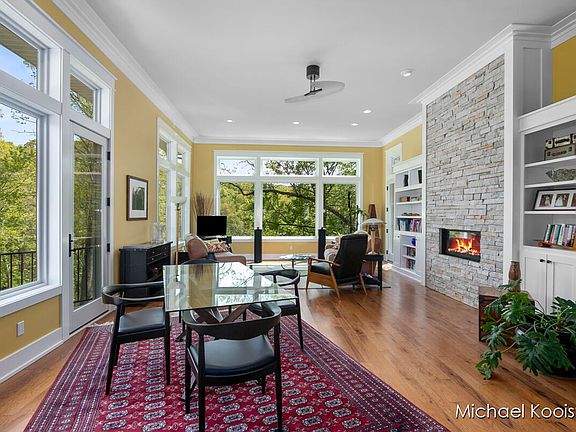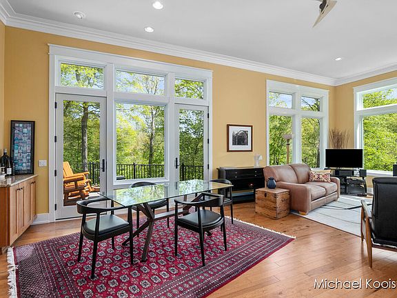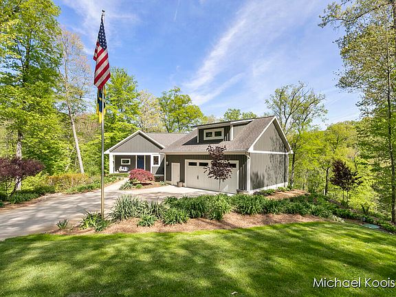 Don't miss this stunning walkout Ada ranch in a private park-like setting on almost 3.2 acres! This architecturally impressive custom single-owner home features a lovely open granite and stainless kitchen, extra high ceilings, tons of transom windows for natural light, and huge composite balconies perched among the trees. Main floor living room with fireplace, main floor primary suite, an enormous 4+ car 1000 sq ft garage, and secluded wooded setting with a stream are among the additional important selling features. And it's conveniently only 1.5 miles from downtown Ada. The walkout level offers 2 additional bedrooms with walk-in closets, a full bathroom, family/media room, fabulous screened-in porch and laundry. The landscaping is also fabulous! This is definitely NOT one to miss!