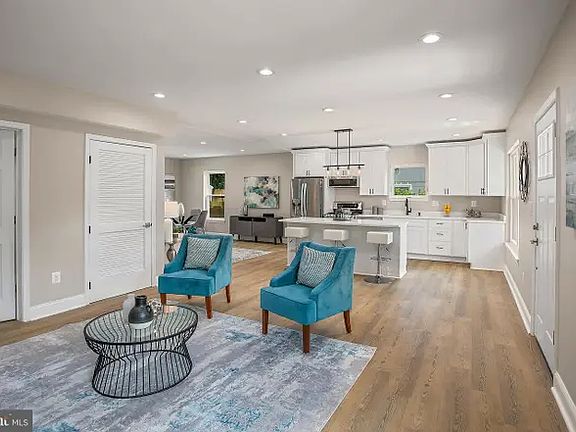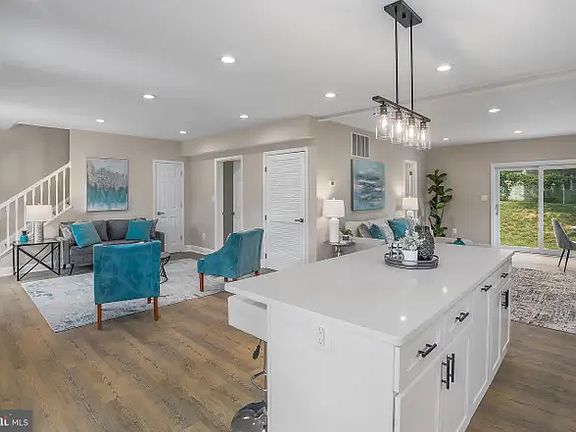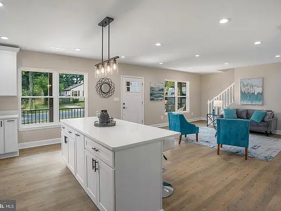 Modern farmhouse style with open floor plan, laminate flooring throughout, and updated kitchen with large island, marble countertops and new stainless steel appliances. Main-level bedroom + full bath. Upstairs are 3 bedrooms including a large primary suite with an amazing en-suite bathroom! Double vanity, large separate soaking tub and modern tiled shower. Sliding glass doors to a patio and backyard with gazebo! Private patio & backyard with fences all around. Short walk to easy transportation, dining & shops at Rockville Town Center!