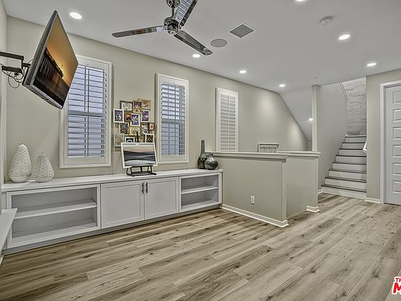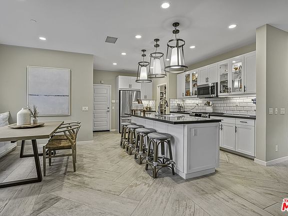 Welcome to your dream home, just 10 minutes from Disneyland in Canvas Community! This stunning former model home features 3 bedrooms and 3 bathrooms, offering over 2,400 square feet of modern luxury. Enjoy the spacious open-concept design with a bright living/great room, gourmet kitchen, and dining area conveniently located on the first floor. As you enter, you'll be greeted by a welcoming great room that flows seamlessly to the outdoor patio, perfect for entertaining. The gourmet kitchen includes a large central island with a sink, and the dining area boasts built-in seating for /friend family gatherings or a cozy meal. Newly installed flooring leads you up to the second level where all three bedrooms are located with a versatile loft area, ideal for a playroom, craft space, cozy reading nook or anything you can imagine. Retreat to the primary bedroom, a tranquil sanctuary featuring elegant V-groove paneling and a nearby custom dog room. The third level showcases a vast bonus space complete with built-in cabinets, an under-counter fridge, and a wine chiller, perfect for entertaining guests. Move onto the serene rooftop patio to enjoy breathtaking views and the nightly Disneyland fireworks. Equipped with cutting-edge smart home technology, controlling everything from lighting to security is effortless. Community amenities include pool and community area. Situated next to the Anaheim Packing House, this detached home offers the perfect blend of comfort, convenience, and a sprinkle of magic. Your story begins here!