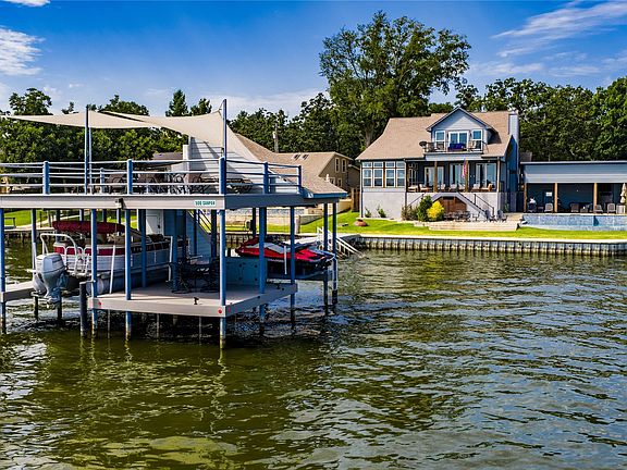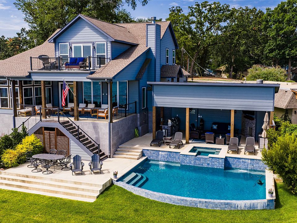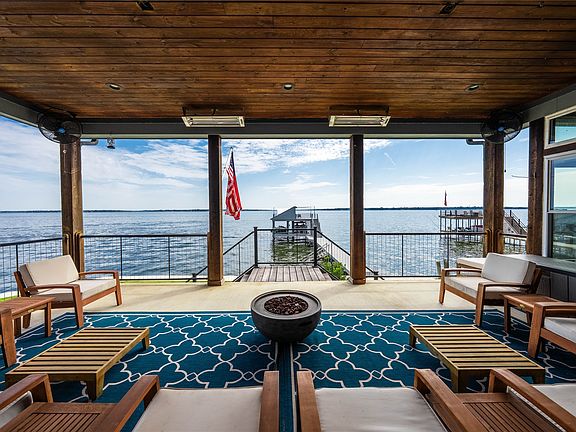 Custom - built in 2018, this stunning home showcases 10-foot ceilings, wide open spaces, and incredible water views throughout. Featuring two spacious living areas and a chef's kitchen with gas cooking, island serving bar, and premium finishes, it's designed for effortless entertaining. The primary suite on the main level offers a serene sitting area , while three private guest suites provide comfort for family and friends. Outdoor living shines with a covered porch equipped with ceiling heaters, a balcony off the upstairs living area, and a cabana, outdoor kitchen, fireplace, TV, and sound system overlooking the sparkling swimming pool.