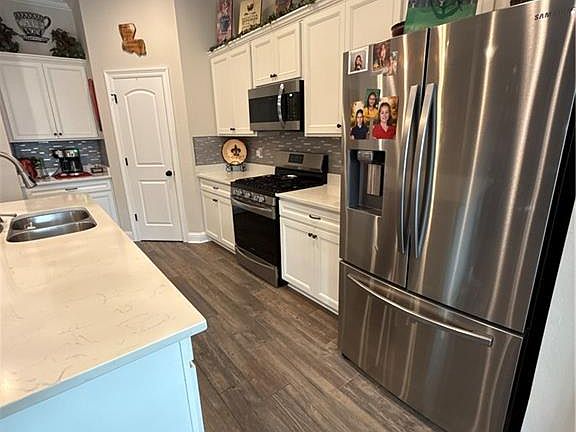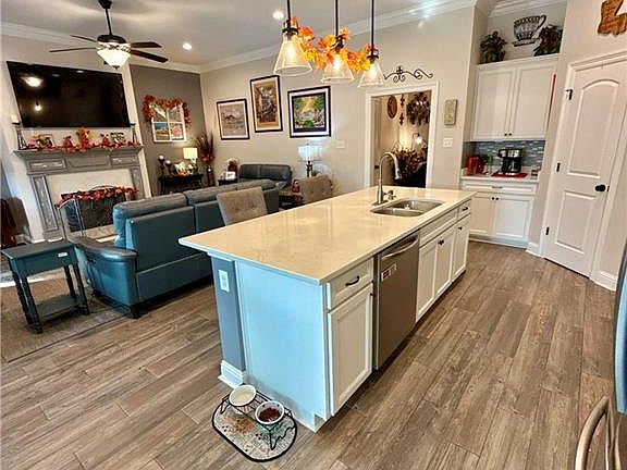 Inside, you’ll love the NO carpet—tile flooring runs throughout the entire home for durability, low maintenance, and a clean, modern look. The open layout features a welcoming living area with a gas log fireplace and custom blinds that add both style and function. The modern kitchen includes a stainless gas range and microwave, upgraded cabinetry with sleek hardware, quartz countertops, and recessed lighting that enhances the warm ambiance.