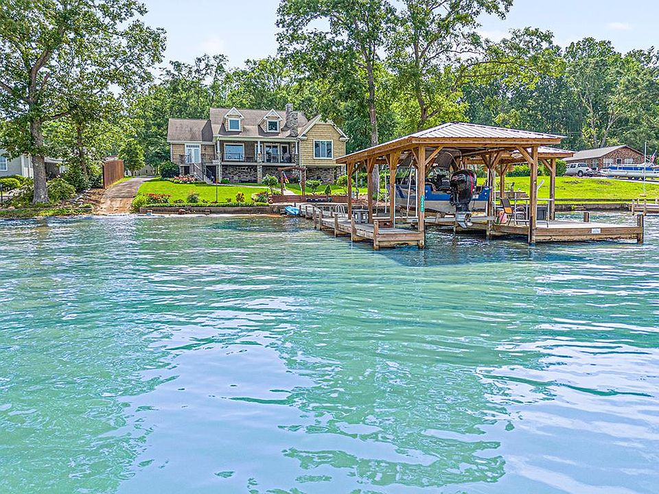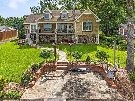 Welcome to a one-of-a-kind custom-built lakefront home on the Greenwood side of Lake Greenwood, perfectly situated on deep, open water with unobstructed long-range views. Located in a rare non-restricted area with no HOA, this property offers both privacy and convenience—just minutes from grocery stores, gas stations, and some of the lake's most popular restaurants. The home's curb appeal is exceptional, with a combination of natural stone, high-quality siding, and detailed stonework around the exterior. A covered front porch with stone columns offers a warm welcome, while the well-manicured lawn and irrigation system sourced from the lake make upkeep simple. Adjacent to the home is a separate guest house, connected by a breezeway, featuring a 1-bedroom, 1-bath layout with a newly updated kitchen, walk-in closet, and comfortable den—ideal for guests, or multi-generational living. An additional outdoor storage building provides room for tools, lake gear, and hobbies. Step inside the main home to find quality craftsmanship throughout. The open floor plan is marked by arched openings, white columns, hardwood floors, and encased double-pane windows that fill the space with light. The formal dining room flows seamlessly into the great room and kitchen while retaining its own elegant identity. The great room is centered around gas fireplace with a built-in entertainment cabinet and custom lighting fixtures with matching ceiling fans. Sliding doors open directly to the lake-facing deck, showcasing the expansive views. The kitchen is built for both beauty and function, with granite countertops, slide-out cabinet shelving, built-in pantry, stainless steel appliances, and an oversized island with glass-front, lighted display cabinets. The breakfast nook offers unobstructed views of the lake, making it a perfect spot for coffee or casual dining. The primary suite is a private retreat featuring tray ceilings, a gas fireplace, and direct access to the covered deck. The ensuite bath includes an oversized marble walk-in shower with a bench, antique clawfoot soaking tub, extended dual vanity, linen closet, his-and-hers closets, and thoughtful finishes throughout. The laundry room is equipped with built-in cabinetry, and a utility sink, with access from both the hallway and the primary bath for convenience Two additional bedrooms are positioned on the opposite side of the home in a split floor plan, along with a full guest bath and a half bath off the main hall. A custom oak staircase with decorative iron railing leads to the upper level, where you'll find a cozy sitting area, a spacious bonus room, and an additional full bath. The upper space is served by central HVAC as well as a separate Sanyo wall unit for added comfort. Beneath the home, the encapsulated crawlspace with a dehumidification system ensures a clean, dry, and well-maintained foundation. The lakeside exterior is designed for entertaining and enjoyment in all seasons. A covered deck, accessed from the living area and primary suite, offers a shaded area for outdoor dining, while the adjoining open-air deck is ideal for grilling. Iron-railed stairs lead to a stone patio below which includes a stunning wood-burning fireplace with direct lake views. From there, a custom stone walkway leads to a beautiful stone patio at the water's edge. A professionally built retaining wall adds structure to the shoreline and blends into the landscape. At the water's edge, a gently sloping, sandy beach provides an easy, natural entry into the lake—perfect for swimming or simply relaxing by the shore. The property also features a private concrete boat ramp, an incredibly rare asset for any lake home. The private dock includes wood decking, a covered boat lift, and a sunbathing platform, with deep water access. The attached two-car garage includes built-in storage and connects directly to the breezeway leading to the guest house. This home offers one of the best locations on the lake as well as by la