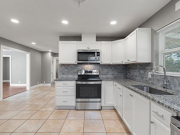Sleek white cabinetryExpansive backyardLarge covered patioGranite countertopsRenovated kitchenNew stainless steel appliancesDesigner backsplash