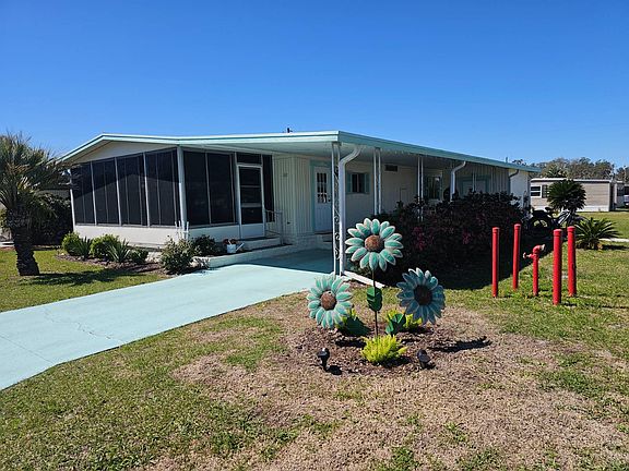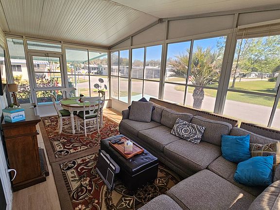 BACK ON THE MARKET DUE TO HEALTH REASONS!! Come enjoy this home located on a large corner lot with plenty of room! The home has a huge screened in lanai with wood look tile floor, vinyl windows, double sliders with screens, newly sealed roof, NEW AC, new stand up showers in both bathrooms, laminate flooring throughout and much more to see in this meticulously kept home! Washer and dryer are both located in the shed along with storage. The home has some little touches that make it more and more appealing and best of all it comes fully furnished, so dont wait to see! Lot rent is the lowest around at $375 a month! Call or text to see.