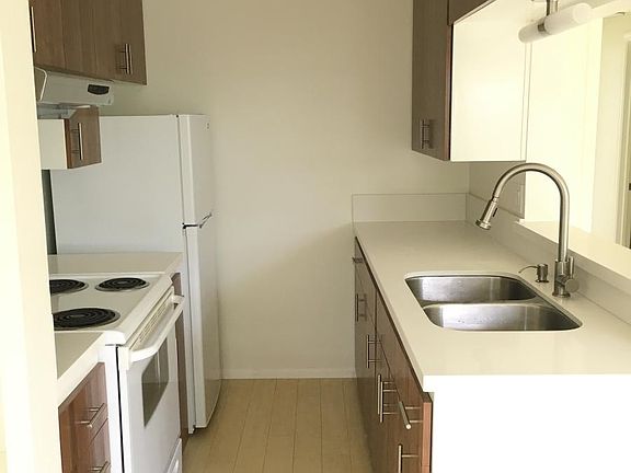 Block to ocean beachLacquer like white paintStainless undermount sinkWhite quartz counterStainless appliancesLots of lightBlack walnut doors