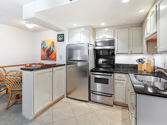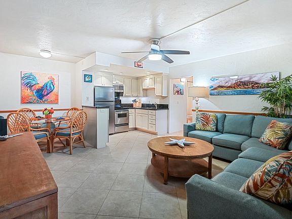 Discover paradise in this charming 1-bedroom condo in sunny Poipu, surrounded by lush grounds and beautiful landscaping. The property features a sparkling swimming pool and a BBQ picnic area, perfect for relaxing in the tropical ambiance. A sleeper sofa accommodates up to four adults, while ceiling fans and two floor AC units maintain comfort year-round. The kitchen boasts solid granite countertops, modern appliances, and stylish cabinetry, and the bathroom features a custom tile shower and updated fixtures.