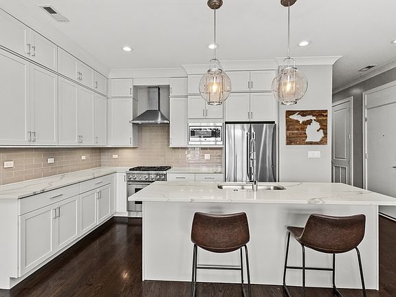 Welcome to this Stunning 1600 SF Corner Unit Condominium in the Heart of Lincoln Square, offering a Rare Blend of Modern Luxury, Thoughtful Design, and Unparalleled Outdoor Space on the One-of-a-Kind Private 960 SF Terrace. Step inside to find Tall Ceilings, Custom-Stained Hardwood Floors, and Ornate Millwork that highlight the Open Floor Plan. The Gourmet Kitchen is a True Showstopper, featuring 42" Cabinets with Under-Mount Lighting, Quartz Countertops, a Large Island with Seating for Four, Custom Backsplash, Thermador Dishwasher and Range with Exterior-Vented Hood, BOSCH French Door Refrigerator with Ice Drawer. The Kitchen flows seamlessly into the Living Room with its Tile Surround Gas Fireplace, Custom Built-ins, and Access to the Private Balcony with Composite Decking. An Entertainer's Dream, the One-of-a-Kind 960 SF Private Terrace complete with Built-in Fireplace, Italian Porcelain Pavers, Direct Gas Line for an Outdoor Kitchen, Water Spigot, Lighting, and Built-in Speakers is perfect for Gatherings, Grilling, or Quiet Evenings under the Stars. The Oversized Primary Suite features a Walk-in Closet with Custom Organizers and a Luxurious EnSuite with a Double Sink Quartz Vanity, Walk-in Steam Shower with Bench, and Linen Closet. Two Additional Bedrooms provide versatility for Guests, Family, or a Home Office. Additional highlights include: Built-in Speakers in Living Room, Primary Bedroom, and Terrace, 8' Solid-Core Doors, Custom Window Treatments, Convenient Mudroom Area with Seating, Hooks and Cabinetry, Smart Thermostat, LED Recessed Lighting, In-Unit Front-Loading Washer and Dryer, Gas Line on Front Porch, On-site Storage, Bike Storage, Central Heat and Air, Heated Garage Parking (Space #5) included. This Sought-after Budlong Elementary and Amundsen High School District Location is Moments to: Rockwell & Western Brown Line Stations, Ravenswood Metra, minutes to Winnemac and River Park, steps from Shopping and Dining, and you'll love the Annual Street Festivals.