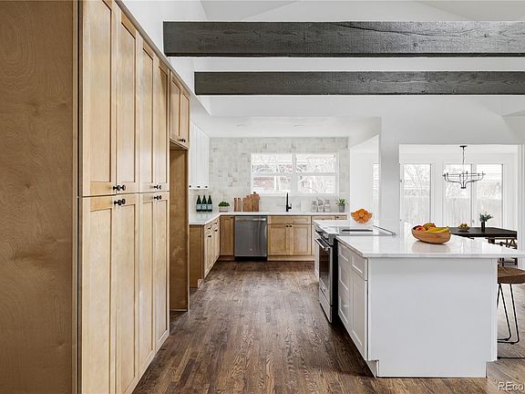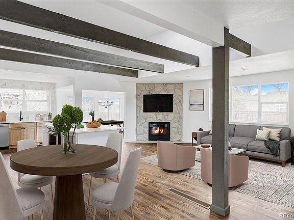 Welcome to this beautifully reimagined Denver home in the highly coveted Pinehurst Estates neighborhood—fully renovated with modern finishes, thoughtful updates, and sun-filled spaces throughout. Vaulted ceilings, a skylight, and abundant windows create an open, airy atmosphere, while dark exposed beams and a wood-burning fireplace bring warmth and architectural character to the main living area. The stunning kitchen features stainless steel appliances—including a dishwasher, disposal, microwave, and range with a downdraft vent—plus abundant countertop and cabinet space with two-tone shaker cabinetry and sleek quartz surfaces. The main level offers three bedrooms, including a serene primary suite with a walk-in closet and an en-suite ¾ bath with double sinks. A full hallway bath with double sinks serves the additional bedrooms. Downstairs, a massive family room provides the perfect backdrop for movie nights, a home gym, or play space. Two non-conforming bedrooms with large closets, a ¾ bath, and a convenient laundry closet add flexibility for guests, work, or hobbies. Outside, the front yard features a new sprinkler system and is prepped for fresh sod—plus the seller is offering a $1,200 sod credit so you can complete the finishing touch your way. Renovations include a new roof; brand-new furnace, AC, and water heater; all new hardwood, tile, and carpet flooring; updated bathrooms with new vanities and designer tile surrounds; fresh interior and exterior paint; and new baseboards, lighting, plumbing fixtures, and door hardware throughout. Every detail has already been handled—just move in and enjoy. The location can't be beat - a prime Southwest Denver location near parks, trails, and Marston Lake, with quick access to shopping, dining, Southwest Plaza, Santa Fe Blvd, and Hwy 285. Mature trees and nearby amenities make this a highly convenient and sought-after community. Schedule your showing today and jump on this opportunity before someone else does.