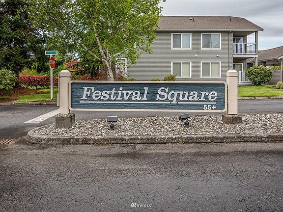 A ground floor, end unit at Festival Square Condo. Located in an active 55+ community with a club house. The condo features; 2 bedrooms, 1.5 baths, carport & outside storage room. Unit lives large... the home is tucked away to the back of the complex and overlooks a natural green belt, a pond & abundant wildlife. Enjoy the views from the large private covered patio. The Cordata location is ideal with close proximity to shopping, restaurants, medical access, the local CO-OP, WTA transit and park trails.