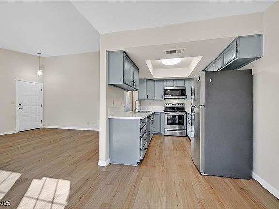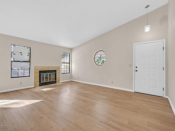 Located in a gated Santa Fe styled community with a sparkling pool and spa, this beautifully upgraded home offers comfort and style throughout. Enjoy durable vinyl flooring and a kitchen equipped with stainless steel appliances, a breakfast nook, and a convenient breakfast bar. Both bathrooms have been updated with floor-to-ceiling tile, modern vanities, and the master bath features a relaxing jetted tub. The spacious living room boasts vaulted ceilings, a cozy wood-burning fireplace, and access to the front balcony complete with patio furniture and an umbrella that create a resort-like feel. The master bedroom includes a private covered balcony with upgraded shades, perfect for unwinding. Additional highlights include ceiling fans in every bedroom, a washer and dryer, and the convenience of no carpet. Ideally located near UNLV, shopping, dining, the airport, entertainment, the Strip, and freeway access, this property is ready to welcome you home.