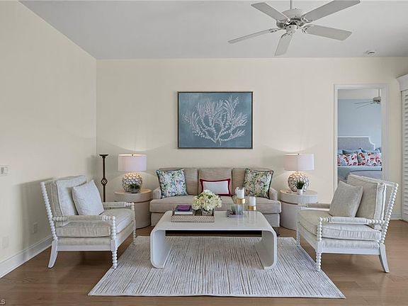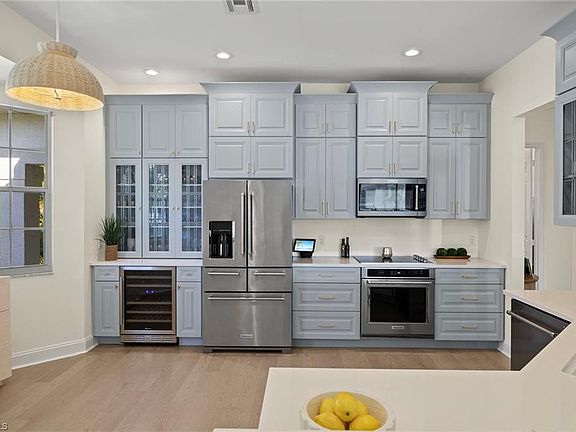 Welcome to 5065 Yacht Harbor Drive in desirable Marina Cove of Windstar on Naples Bay. This thoughtfully renovated end unit townhome features a welcoming entry foyer leading up to the gorgeous, light filled open-concept living space. New hardwood floors throughout. Spacious new custom eat-in kitchen replete with KitchenAid stainless steel appliances, custom cabinetry, bar area with wine refrigerator, white quartz countertops including breakfast bar which is ideal for entertaining or daily casual dining. Lovely living room and dining area with wall of glass opening to screened-in lanai seamlessly blending indoor/outdoor living. Gorgeous western facing lake and sunset views. Master suite oasis with spacious bedroom with lake views, spa-like new bath including marble tile, double vanity, step-in shower, soaking tub and separate water closet plus dual closets. Charming guest bedroom plus new hall bathroom. Den is great flexible living space for home office, media room or additional guest quarters. Convenient full size laundry room. 2-car attached garage with epoxy floor. Truly exceptional and move-in ready. Windstar on Naples Bay is the only gated golf community with Tom Fazio designed 18-hole golf course (separate membership) that offers direct bay access, a private beach plus dock on Keewaydin Island with boat shuttle plus a full service 73-slip deep water marina. Newly renovated clubhouse (separate membership) with multiple dining areas with stunning views of Naples Bay and Port Royal, billiards room, 6 Har-Tru tennis courts, bocce courts and a state of the art fitness center slated for mid-2026 completion. Preferred location just a short drive via car, bike or golf cart to downtown's 5th Avenue known worldwide for its fine dining, shopping and beaches. Situated in the vibrant Bayshore Arts District, Windstar is walkable to Naples Botanical Garden and Naples Pickleball Center home of the pickleball US Open. Easy access to I-75, Naples and Fort Myers airports.