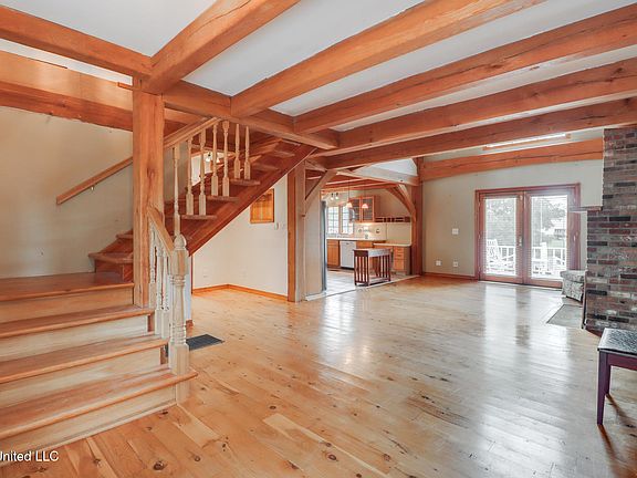 Custom Red Oak beams and finishes imported from ''up north'' welcome you into this custom built Lake House in Kiln, Mississippi. Nestled on a 1.9 Acre parcel in Ridgewood, you're close to town but far enough away to enjoy quiet country nights and beautiful skies at sunrise and dusk. Large covered front and side porches. Detached Garage. Near the end of a cul-de-sac. Upon entering you'll be wowed by the custom woodwork. Soaring ceilings in the living room opening to the cat walk. Wood burning fireplace from hearth to ceiling. On the main level enjoy nights by the fire and cooking in the large kitchen - all with sights to the lake. The Master Bedroom is just off the living room with a large bathroom and on suite access to the back deck too. To finish up living on the main level you'll find a private office with french doors and the laundry room. Up the stairs is a full bath with custom ceilings and two larger guest bedrooms. Out the back door enjoy the large deck, sights of wildlife, and cool nights. MUST SEE to appreciate. One of a kind home - a rare find in this area.