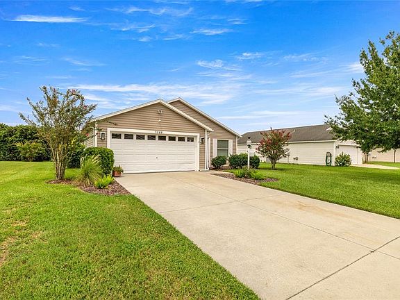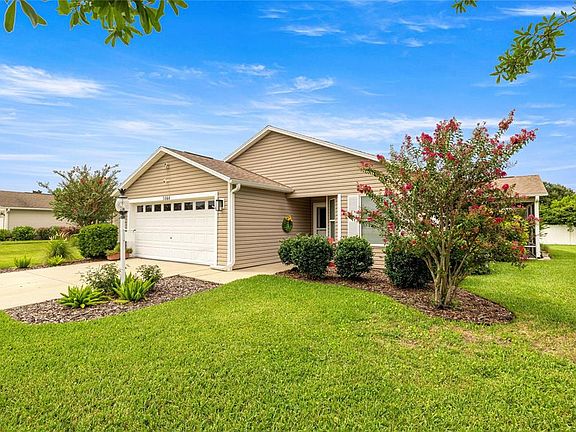~~Exceptional value for today's market~~ Seller's are eager to make a move. Prime Location Near The Villages Charter School! Easy golf cart assessable to all The Villages offers. Welcome to this beautifully maintained 3-bedroom, 2-bath At Ease model home, complete with a 2-car garage, located in the highly sought-after family-friendly neighborhood of Bison Valley. Just under a mile from The Villages Charter School and close to CR 466, providing easy access to the area’s most popular restaurants, shops, and essential services. This home offers the perfect blend of comfort, convenience, and lifestyle. Step inside and immediately feel at home with luxury vinyl plank flooring throughout—no carpet, fresh paint, and soaring ceilings that create a bright, airy atmosphere. The spacious open-concept layout is perfect for both everyday living and entertaining. The kitchen is a standout feature with light cabinetry, a stylish backsplash, new light fixtures, stainless steel appliances, and a large farmhouse-style sink. The indoor laundry room offers plenty of space and storage. The guest bathroom is smartly placed near the guest bedroom, providing privacy and functionality. The master suite is a true retreat, featuring vaulted ceilings, a lighted ceiling fan, a spacious walk-in closet, and an ensuite bath with dual sinks and ample counter space. Step out through the sliding glass doors onto a screened lanai, ideal for morning coffee or relaxing evenings. Just beyond is a concrete patio slab, perfect for grilling and outdoor gatherings. The lush backyard and blooming crepe myrtle tree out front add charm and curb appeal. Live minutes from shopping, dining, and entertainment near CR 466 and at Lake Sumter Landing. Whether you’re raising a family or looking for a peaceful neighborhood with easy access to The Villages, this home checks all the boxes!