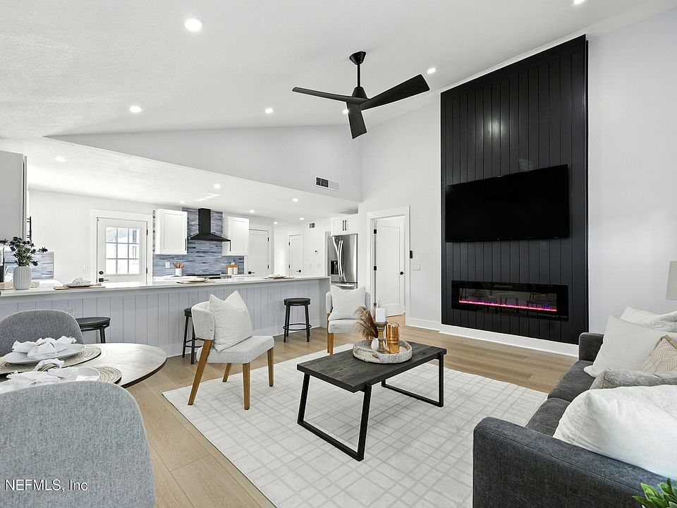 This fully renovated 4-bedroom, 2-bath home blends modern elegance with beachside charm—just 4.5 blocks from the ocean. The chef's kitchen is a showstopper, featuring white shaker cabinets, premium white quartz counters, a bold black hood, a Kohler undermount sink, blue tile backsplash, a wine cooler, and LG stainless steel appliances with an induction cooktop. Wide-plank luxury vinyl flooring flows throughout, complemented by recessed lighting, stylish fixtures, and a shiplap fireplace wall with an electric fireplace and an INCLUDED 65'' LG TV. The primary bedroom includes a built-in closet organizer and barn doors, while the guest bath showcases marble flooring with all-porcelain fluted tile walls, and the second bath features wall tile paired with shiplap. Brand new windows and doors, including French doors with built-in blinds in the back bedroom, fill the home with natural light, while new siding and lush zoysia grass enhance curb appeal. Walk-in closets provide ample storage,and every major system has been replaced, including the roof, HVAC, electrical, plumbing, and tankless water heater, ensuring peace of mind for years to come. Outside, a paver patio and fenced backyard with a durable vinyl fence create the perfect space for entertaining or relaxing in privacy, all on a 50' x 125' lot (plenty of room for a pool), making this beachside living at its finest. A Blink floodlight is included. **Option to purchase the Seller's 6-seater 2024 D5 Evolution Golf Cart. *Shed sold AS-IS. ***Seller's preferred lender is offering up to a 1% credit, which may be applied toward buyer's closing costs, a permanent rate buydown, or a temporary buydown program. Credit is subject to buyer qualification and program guidelines.