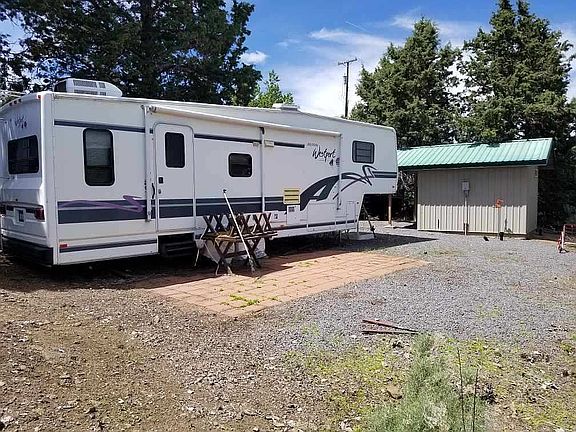 It also has a Fleetwood Avion Westport 34-foot fifth-wheel 1997 nicely situated on the upper level that provides outstanding views of the lake. This RV has two slide-outs, one in the living room and one in the bedroom. It has been used seasonally and covered when not in use. Features include: ceiling fan, sleeper sofa, two recliners, “L” shaped kitchen, oak cabinets, and double white porcelain sink. A queen bed, large bedroom closet w/mirrored doors, full-sized shower, sink and mirror near bathroom. Plumbed for a stack washer and dryer, large awning, built-in stereo and speakers and TV. All mini blinds are functional and on all windows. Air conditioning and heat ducted. Country blue color theme.