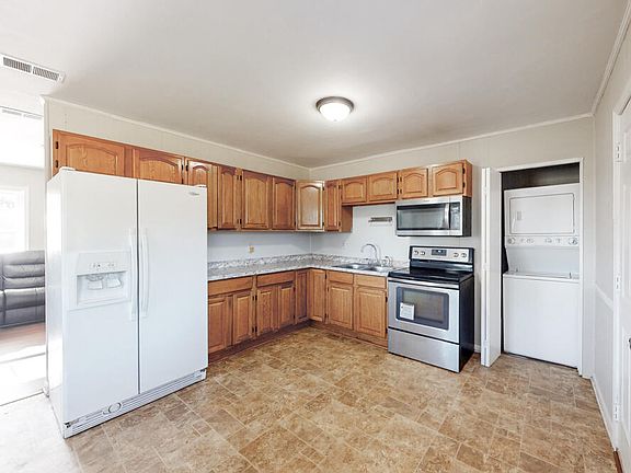 Completely move-in ready 3 bedroom 1.5 bathroom home on a large half acre level lot! The light and airy living room has wood flooring and a coat closet! No carpet, making everyday life a breeze! The kitchen is equipped with a range, a built-in microwave and refrigerator! The dining room with a chairrail is the perfect spot for casual meals! The owner's suite has a ceiling fan and a private half bathroom! Two additional spacious spare bedrooms each with ceiling fans! Full bathroom with a nice vanity! The stackable washer/dryer can stay! Enjoy the huge level backyard with a great play area! Hurry to see this gem!