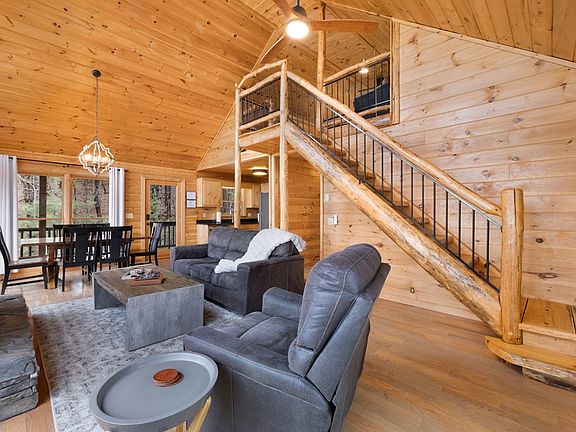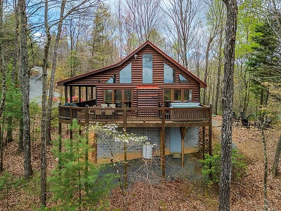 Perched up high in the mountains of Cherry Log, this cozy cabin/chalet is perfect for soaking in those AMAZING long-range views all year round. With nearly 3 acres of wooded land, you can enjoy the peace and quiet knowing that you own the view and can keep it that way. The wrap-around porch and big open deck are ideal for relaxing and taking it all in from your bubbling jacuzzi tub. Inside, the cabin has a warm, all-wood interior with lots of big windows in the dining and living room areas, letting in tons of natural light. The centerpiece is a cool stone fireplace, surrounded by tall windows that make the space feel open and inviting. The hardwood floors and unique log staircase add to the rustic charm, leading up to a huge open loft/room that looks out to your stunning mountain views. The kitchen is spacious and open with updated appliances. The main level features a primary suite with bathroom, a guest room that opens up to your deck, hall bathroom and laundry closet. Only 5 miles from the Hwy 515 Corridor, this place is moments away from Blue Ridge, Ellijay, National Forest Acreage, close to Rich Mountain Wilderness, Cohutta Wilderness and Fightingtown Creek. It's super easy to get to and best of all, there are no rental restrictions!