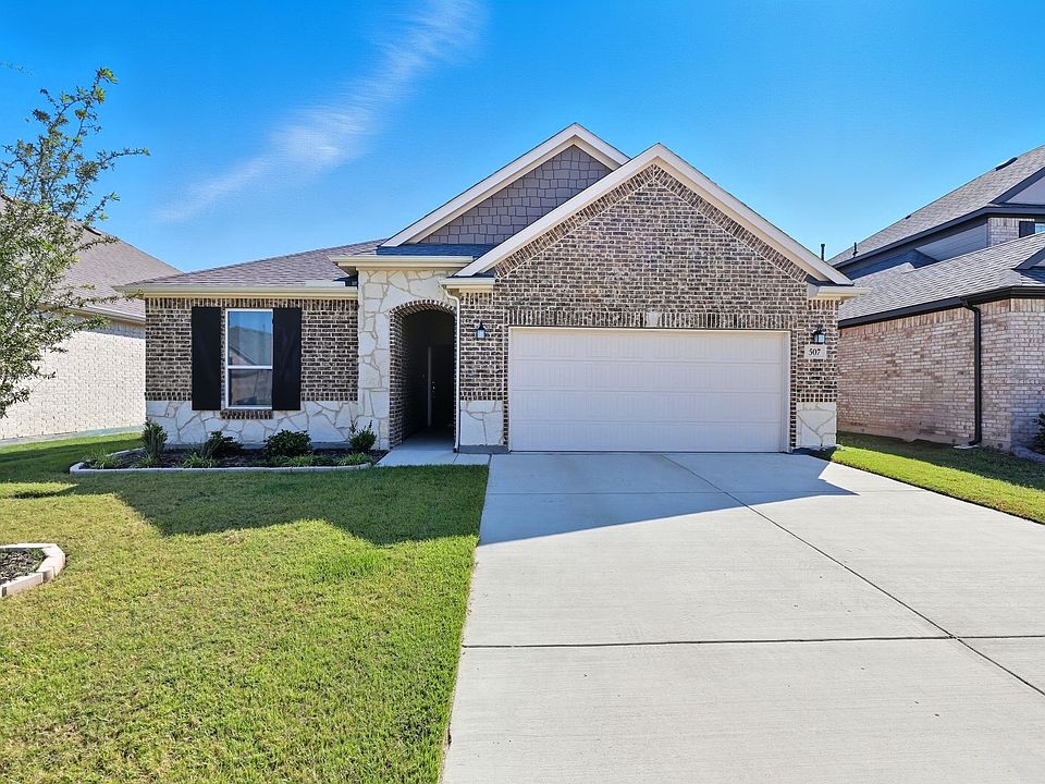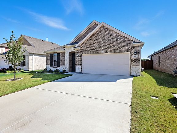 Welcome to your beautiful home at The Preserve in Justin Texas! The home features a striking brick and stone exterior with buff mortar, open floorplan, 3 bedrooms, 2 bathrooms, den with door for privacy, 9 ft. ceilings, ceiling fans, 5in baseboards, garage door opener, luxury vinyl plank flooring in main living areas, carpet in bedrooms, and ceramic tile in bathrooms. The open kitchen features 42in cabinets in ash stain, granite countertops, and modern stainless-steel appliances including gas range, microwave and breakfast bar on the island. Unwind in the owner's retreat bedroom and ensuite bathroom with walk-in shower with high gloss porcelain surround and dual sinks. Enjoy your nicely landscaped yard with a covered patio for relaxing, wood fence, gutters and sprinkler system. This great community has a pool, park with play area and jogging trails.
