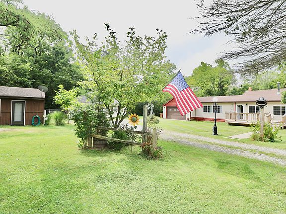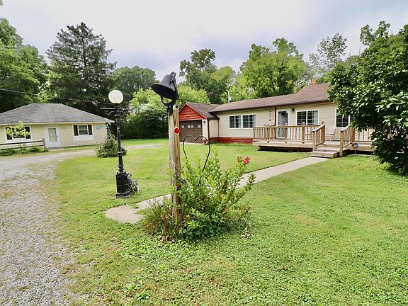 This 3 bdrm, 2 full bath home is inviting & offers many sought after amenities. Remodeled kitchen, new windows w/ transferable warr, new doors, HVAC w/ C/A, wood burning stove, formal dining rm, multiple outdoor entertaining areas, fenced in area for children or pets, basement & MORE. Kitchen has an abundance of cabinetry including: pantry, center island w/ electric cooktop, OH ventilation, double oven & all kitch appliances will remain. Additionally, property has a 705 sqft guest house or rental opportunity w/ new elect f/a furnace. Lastly, 2 car att garage & a detached 585 sqft 1 car workshop all on the premises! Bordered by woods on .58A yet within walking convenience of downtown & school. Seller is providing a 1 yr home warranty