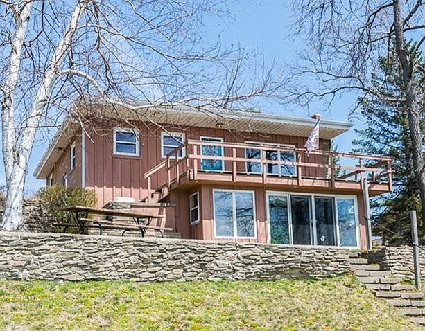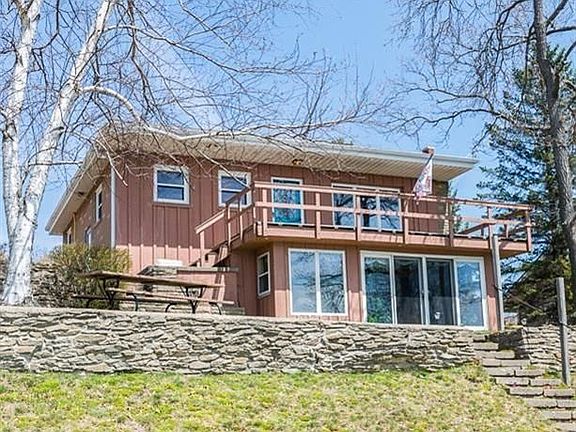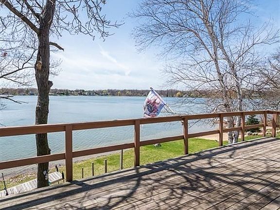 Enjoy the awesome view of private Cavanaugh Lake from your own living room. 3 Bed/2 bath home only steps to sandy bottom on the east side of the lake with the best sunset views and 66' of frontage. Corian kitchen on main floor with full bath, main floor laundry, utility room, and large family room with brick fireplace, lots of built ins and plenty of windows to enjoy the lake view. Upstairs offers 3 more bedrooms, 2nd full bath and 2nd family room (currently used as master) with brick fire place, windows overlooking the lake, and opening up to deck for even better views. Never had pets or has been smoked in. Brand new furnace and A/C, 2 car garage, lots of ledge rock landscaping, and dock included for new owners to come and make their own! Buyer to assume sewer assessment already in the winter tax bill.