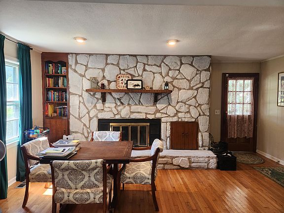 Stone fireplaceNeutral paint colorCozy dining areaQuaint foyerBrand-new double wall oven