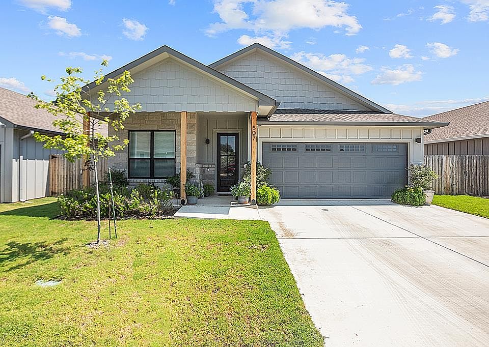 Quality-built GT Development custom home offering 4 bedrooms and 2.5 bathrooms in a thoughtfully designed two-story split floor plan. Modern conveniences include Smart Home technology, spray foam insulation, and soaring vaulted ceilings. The well-appointed kitchen features solid wood box cabinets with soft-close drawers, under-cabinet lighting, quartz countertops with a tile backsplash, and stainless steel appliances. Additional upgrades include custom window blinds throughout. The exterior combines limestone and Smart Siding for lasting curb appeal, while the fully landscaped yard with front and back irrigation provides easy upkeep. Enjoy the outdoors on the 21x7 covered back porch overlooking a privacy-fenced backyard that backs to open space. Home includes a builder 1-2-10 warranty (effective 11/2/23). Short-term rentals are not permitted.