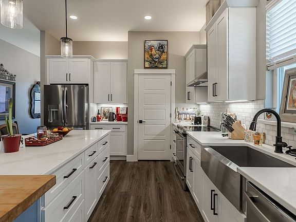Fully landscaped yardStainless steel appliancesCustom window blindsQuartz countertopsTile backsplashSoaring vaulted ceilingsFront and back irrigation