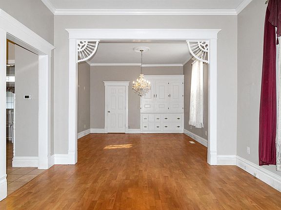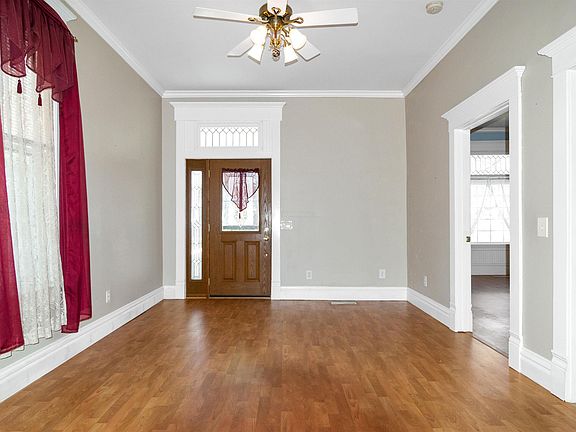 With curb appeal and an excellent location on Evansville's historic Wabash Ave of Flags, this remodeled 3-4 bedroom, 2 bath gem invites you in from the 14' x 15' covered front porch and architecturally correct scalloped siding design. Step inside to the large foyer and notice the 10' ceilings, crown moulding, and impressive woodwork. A large family room flows into a den (used as 4th bed in the past) or dining room with leaded glass chandelier and custom, cedar lined cabinets. The cute kitchen, full bath with stand up shower, and laundry room (ready for a stack system) are located off the dining room. Follow the hardwood steps upstairs to a large landing leading to 3 charming bedrooms with original pine woodwork and pick from cedar lined closets or bay window charm. The bathroom with retro carpet and clawfoot tub is ready for your design, and find more storage in a large, walk-in room. The second floor currently has NO HVAC, but ductwork was proactively ran when the house was remodeled. The back of the property offers a quaint covered rear sitting porch and fenced-in yard. The 1.5 car detached garage has an automatic opener, concrete floor, subpanel, updated roof decking, and alley access. Updates: roof 2023; hi eff HVAC 15 approx 15 years ago for main level; 200 amp breaker; water heater 2008; full remodel 15 years ago consisting of replacement windows, drywall, siding, wiring, plumbing. Below grade offers more storage and unfinished space. This is an estate; home to be sold AS-IS.