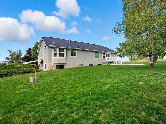 Many possibilities present themselves as you pull up to this one owner, west facing rambler in a desirable location. Will it be the 3.9 acres setup with pressurized irrigation, the 1,000 sqft quonset hut building, the 3 car garage, the private backyard, or the generous size of the home that will bring you a smile... maybe all the above? This home has a spacious layout that was just professionally cleaned. The bright open kitchen includes a large island and corner sink to view the rolling hills that are a backdrop to the backyard. This leads to the mud room and garage or over to the dining area and living space upgraded with a gas fireplace to enjoy cozy winter nights. Generous primary suite roomy enough for a reading nook retreat. Lower level has a finished space setup as a recreation room that could be a dedicated lounge area with entertaining features such as a pool table, or a media room to emphasize entertainment and social gathering. This all leads to unfinished space open to your vision such as additional bedrooms, flex space for office and/or exercise room, etc. The walkout leads to the quonset hut updated with power and the many mature fruit trees. ***Carpets were original to home and worn. Sellers removed so Buyer could select a carpet of their choice. Not due to pets, NO pet order. Sellers are offering a carpet allowance to finish off the upstairs space in your taste.