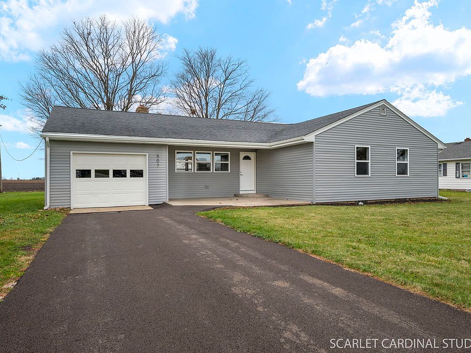 This newly renovated ranch-style home sits on a spacious lot backing to open land just minutes from local schools, Indian Oaks Country Club, and Shabbona Lake State Park. Offering 2 bedrooms and 1 bathroom, the house has undergone extensive updates, including a brand-new kitchen, bathroom, flooring, windows, and more. The expansive living room features new carpeting, a cozy fireplace, and built-in shelving with a storage cabinet connected to the garage for firewood/storage. The kitchen is designed with functionality and style in mind, offering white cabinetry, a custom tiled backsplash, an island with storage and seating for two, recessed lighting, and an adjoining dining area. The bathroom is modernized with a tub/shower combination, shiplap accent walls, a sleek new floating vanity with an integrated sink, and black fixtures for a contemporary touch. Additional highlights include new LVP flooring in the kitchen, dining, hallways, and bathroom, an attached one-car garage, refreshed exterior, neutral paint, and a full basement with sealed/painted floors and walls for extra storage or additional living space. Located in the Indian Creek School District 425, this home is a fantastic opportunity - schedule your visit today to see all it has to offer!