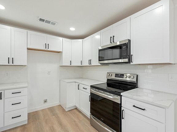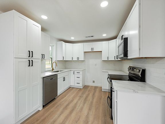 ALL APPLIANCES INCLUDED! NO CARPET. Spacious living room with fireplace, large kitchen with added storage, CORNER LOT means privacy! Completely renovated with new wood-look LVP flooring, new paint, new cabinets, and so much more top to bottom. Energy efficient with newer AC, new windows, and new water heater. Refrigerator, washer and dryer provided. Master walk-in shower with frameless glass, new water and light fixtures throughout, spacious backyard with covered patio. Truly a great home