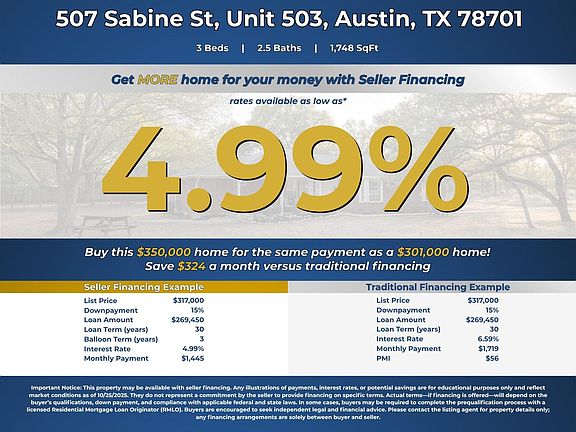 1 YEARS HOA PAID BY SELLER. Welcome to urban living at its finest in the heart of Downtown Austin. This stylish 1-bedroom, 1-bath condo at 507 Sabine St #503 is the ultimate spot for University of Texas parents, alumni, and fans - your home base for weekends in Austin, game day gatherings, and visits with your Longhorn student. Inside, soaring ceilings and west-facing views showcase the Frost Tower, the Texas State Capitol, and the city skyline - plus a glimpse of Waterline, the tallest building in Texas. The kitchen features a center island, stainless steel appliances, and sleek cabinetry - perfect for hosting friends before kickoff or grabbing a bite after exploring campus. The bedroom provides a comfortable retreat, while the bathroom offers convenient access from both the bedroom and entryway, making it easy to accommodate guests. Seller’s updates include a brand-new HVAC system and a new water heater for peace of mind. Step outside and the best of Austin is at your feet. Rainey Street, Red River’s live music venues, East Sixth dining and bars, and the new convention center are all just blocks away. Jog along Lady Bird Lake, or take advantage of walkable grocery shopping just around the corner. And when it’s game day? You’re just minutes from campus - skip the traffic, park once, and enjoy the weekend Longhorn-style. This isn’t just a condo – this is your Austin hub for UT, Downtown, and everything in between. Schedule a tour and lock in your game day and getaway retreat! Exclusive Seller Financing Available: Well qualified buyers can lock in rates from the mid-4’s to mid-5’s (depending on down payment) and save up to $8K in closing costs. Minimum 15% down payment required. All buyers must be pre-approved through Preferred Lender to be considered. No formal underwriting, no discount points, and close in as little as 14 days.