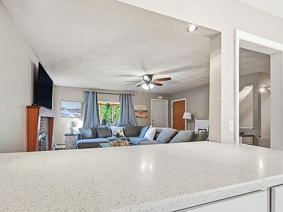 Cozy fireplacePrivate fenced yardIn-ground poolHardwood floorsInviting open-concept kitchenAttached garagePaved driveway