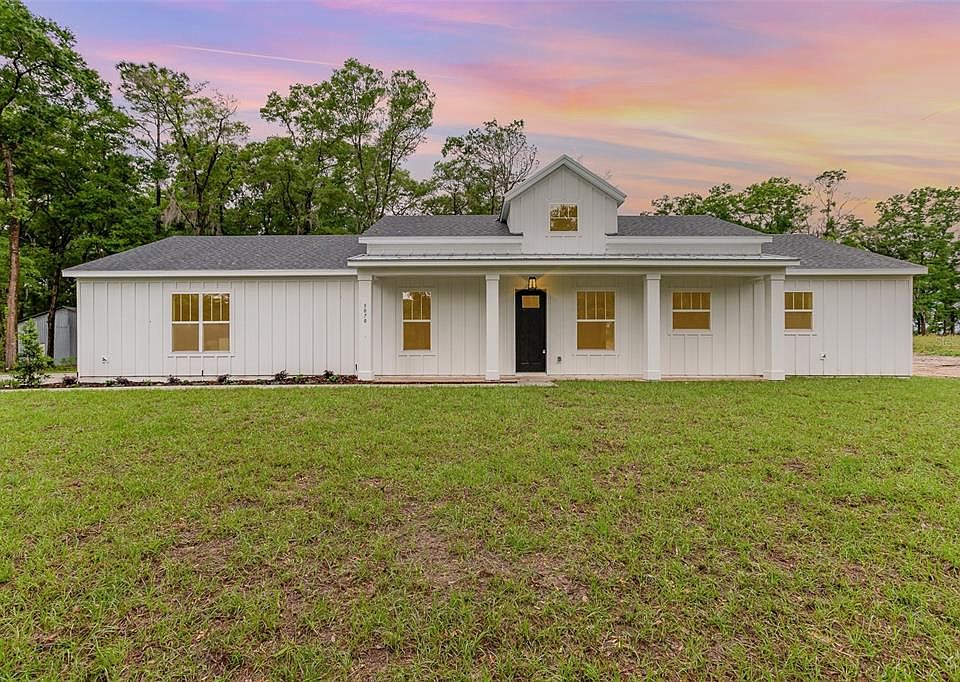 WELCOME TO THE FARMHOUSE OF YOUR DREAMS! This stunning new construction boasts the perfect blend of modern amenities and rustic charm. Situated in the serene NON-HOA neighborhood of Rolling Hills and on OVER 1 ACRE of land, this home offers the privacy and tranquility you've been craving. As you step inside, you'll be greeted by the spacious open-concept living area adorned with beautiful ceramic tiling and HIGH 10-FOOT CEILINGS. The gourmet kitchen is a chef's delight, featuring a large QUARTZ island with barstool accommodation, sleek stainless steel appliances, ample cabinet space, and a gorgeous window above your large farmhouse sink, looking into the yard. Retreat to the luxurious primary suite, complete with a spa-like ensuite bathroom featuring a modern soaking tub, massive 6'x10' WALK-IN SHOWER, dual vanity sinks, and an giant WALK-IN CLOSET. Two additional well-appointed bedrooms, another full bathroom, and laundry room are located on the opposite side of home, with an oversized hallway leading to your spacious 3 CAR GARAGE. Outside, you will enjoy an expansive COVERED PATIO with access from two doors in main living area, perfect for hosting house parties and entertaining. The site plan was designed to accommodate a rear shop/barn - and the builder can do that for you! Rolling Hills is located just 10 minutes away from the World Equestrian Center, 20 minutes away from beautiful Rainbow Springs, and 15 minutes away from I-75 in Ocala! Have your "space" and still be minutes from the city! ** Please note - photos of staging/furniture are of a model, not this actual home. ** Reach out today to schedule your private showing!