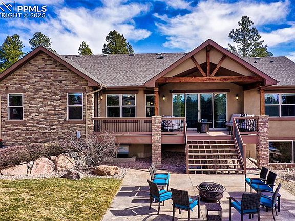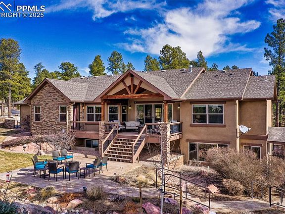 Nestled on 2.56 acres within the highly desirable Black Forest, Cathedral Pines community, this exquisite custom home is surrounded by towering Ponderosa pines. Offering an ideal fusion of luxury and adventure, providing endless opportunities for outdoor recreation, the property's attributes include a treehouse, slide, and zip line. Upon entering the home, you will be greeted by the great room with natural wood floors and a convenient, cozy fireplace. The main floor includes an open-concept kitchen, meticulously designed to harmonize aesthetics and functionality. Featuring granite countertops, an induction cooktop, and double ovens. You will discover a master suite with its spacious walk-in closet and a five-piece master bath featuring a relaxing, massaging, jetted bathtub. Two other main-level bedrooms and the two basement bedrooms all have walk-in closets. Large sliding doors offer breathtaking mountain views, creating a warm and inviting ambiance. New Carpets in all bedrooms and new flooring in the basement. Other notable features include a sound system compatible with online music services and three strategically positioned Wi-Fi hotspots on the main level. The fully finished basement offers multiple amenities. The spacious family room boasts a kitchenette, pool table, and for an immersive movie experience, there is a full theater room with reclining seats. In the spacious four-car garage, you will be greeted by newly painted epoxy floors. The exterior of the property is equally impressive, boasting a heated driveway, a stamped concrete patio, and a fenced-in dog run. Retreat to the back deck and enjoy peaceful evenings, accompanied by the soothing sounds of your own water feature, while a built-in gas line provides the opportunity for outdoor entertainment. Enjoy access to scenic hiking trails, tranquil water features, a stocked fishing pond, and an exclusive lodge. Do not miss the opportunity to make this breathtaking property your permanent residence.